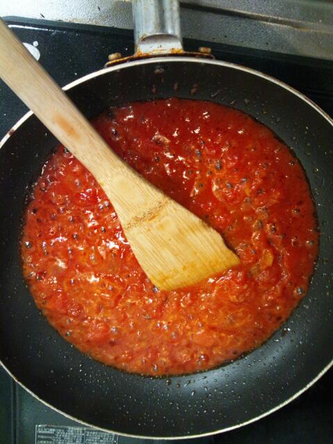 トマトの水分と油がなじんでくる。